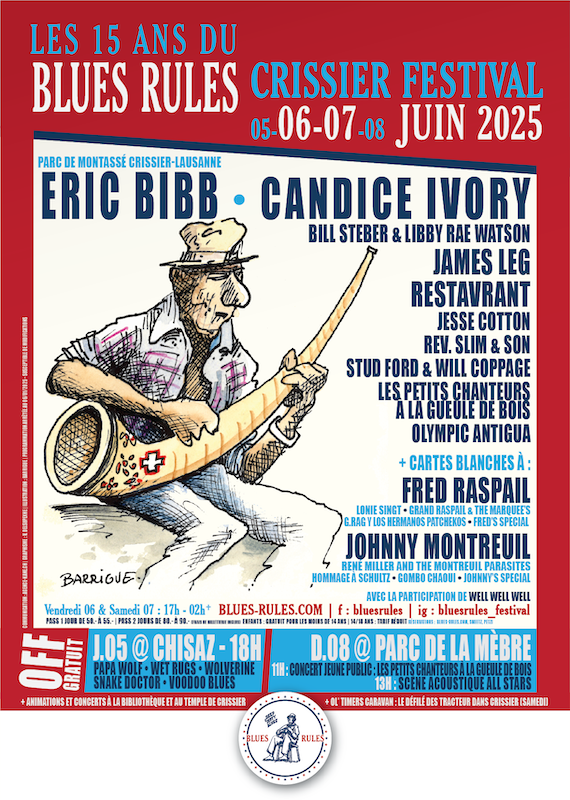 Sur la scène Gab’s, nous aurons Eric Bibb, Candice Ivory, James Leg, Restavrant, Bill Steber & Libby Rae Watson, Jesse Cotton Stone, Rev. Slim & Son, Stud Ford & Will Coppage, Les Petits Chanteurs à la Gueule de Bois et Olympic Antigua. La scène des Pèdzes accueillera les “cartes blanches” à Fred Raspail (avec Leonie Singt, Grand Raspail & The Marquee’s, G.Rag Y Los Hermanos Patchekos Fred’s Special avec Pierre Omer & Monney B.) et Johnny Montreuil (René Miller & The Montreuil Parasites, hommage à Schultz, Gombo Chaoui et Johnny’s Special).
