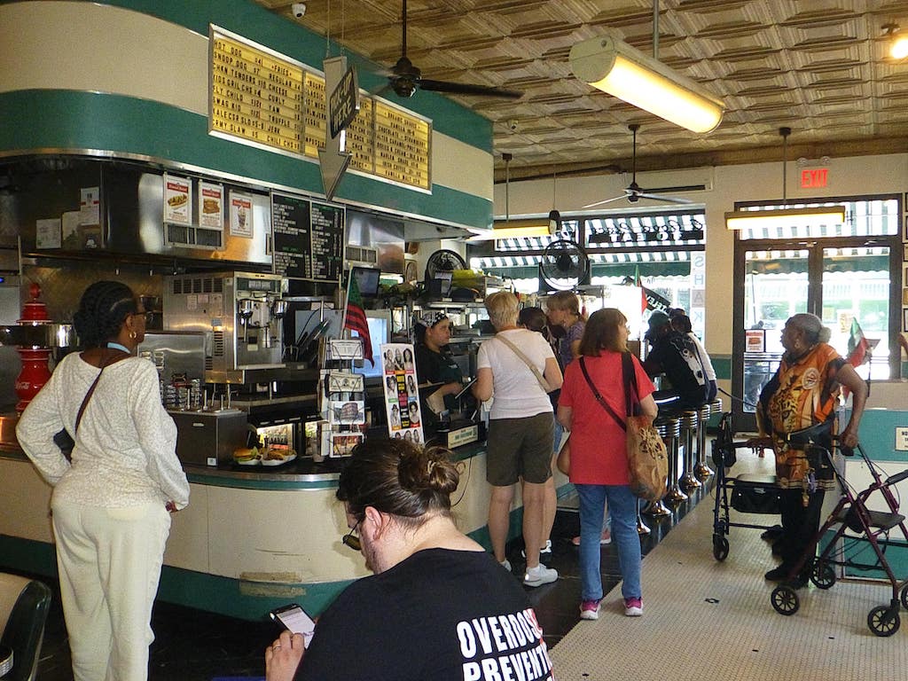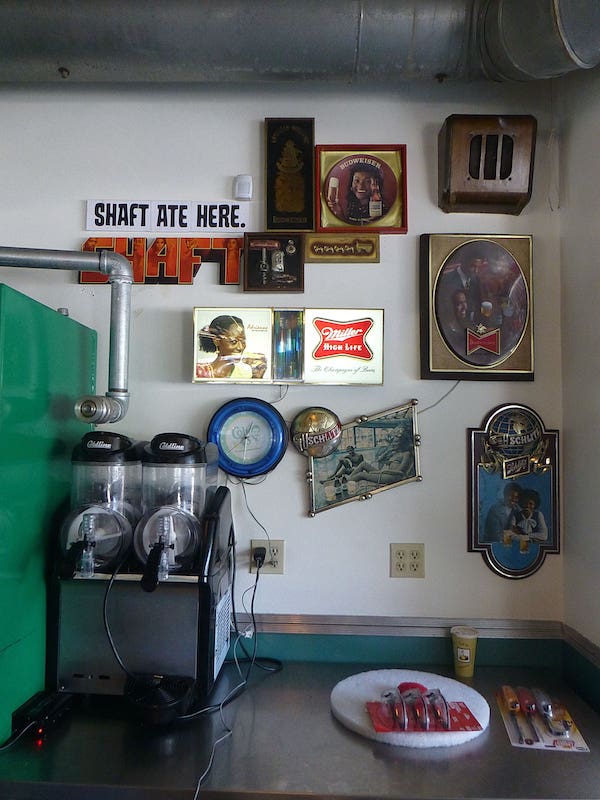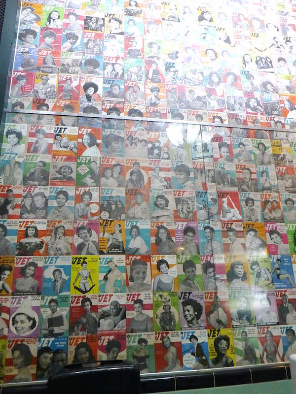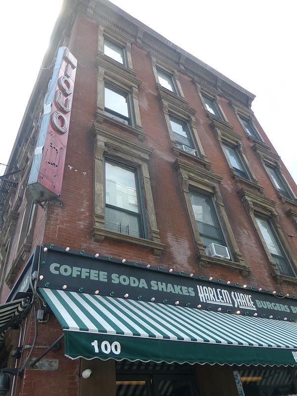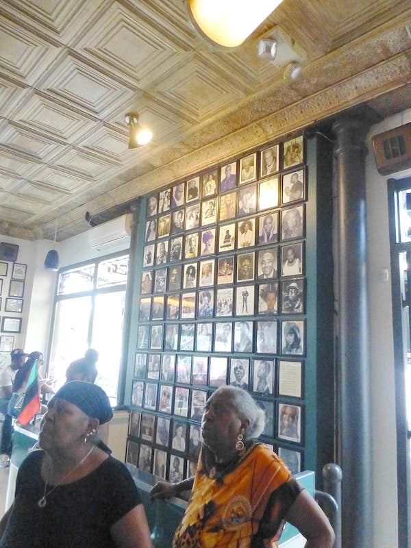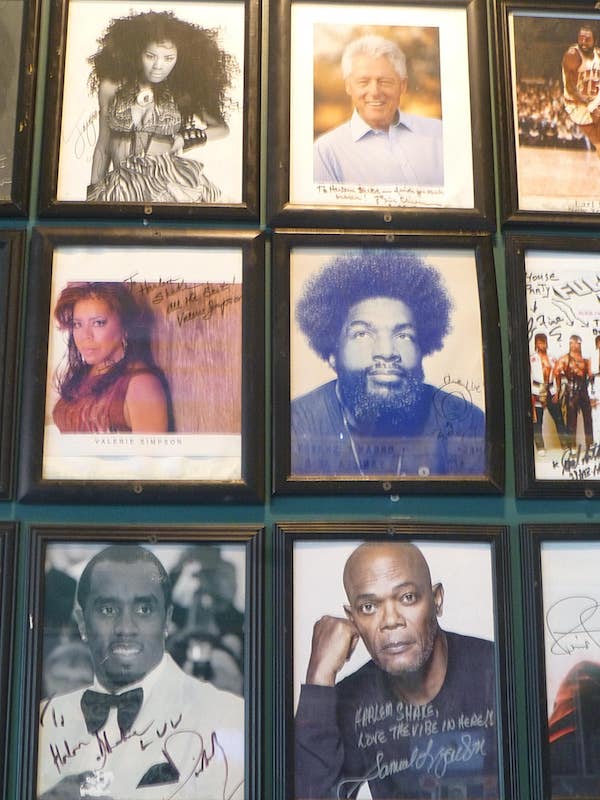 La chaleur atteint son pic du jour : direction le Harlem Shake, vénérable maison située au coin de la 124e et Lennox ave, affichant encore sa fonction première : un diner soul food de quartier à vocation sociale (à Chicago, par exemple, ils n’existent plus). Entrons. Même en touristes, vous êtes plongés dans l’historicité du lieu en faux art déco patiné, comptoir encombré de flyers et lustré par des décades de clients, ses tabourets de bar amortis et quelques tables bistrot brinquebalantes en formica écorné. L’employée de service transpire sous son bandana étoilé et beugle ses commandes à la cuisine Un travailleur social vêtu d’un t-shirt “Overdose Prevention” s’y rafraîchit. Des clientes âgées poussent leur déambulateur. Les prix affichés sont imbattables pour New York. Étant largement senior, je n’ai pas osé demander la différence entre un Fly Child et un Swag Kid, n’étant pas spécialement concerné. Aux murs, d’innombrables photos encadrées, parfois dédicacées, de personnalités afro-américaines qui l’ont célébré, avec une exception : le portrait de l’ex-président Bill Clinton, toujours apprécié pour son empathie à leur encontre. Un coin retiré annonce fièrement : « Shaft a mangé ici. » Mais ne rater sous aucun prétexte les toilettes (mixtes) : ses murs sont entièrement recouverts des couvertures du magazine Jet, sorte d’Ebony populo (avec ses pin-ups ’50s en bikinis), tout un symbole de la ségrégation d’État. Je n’en ai jamais vu une telle quantité !