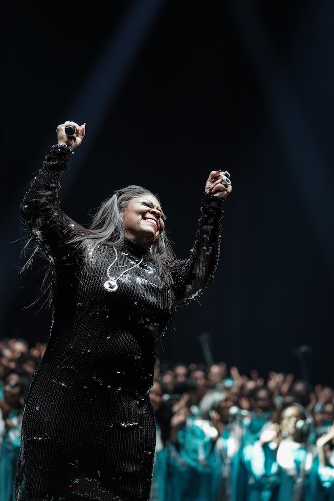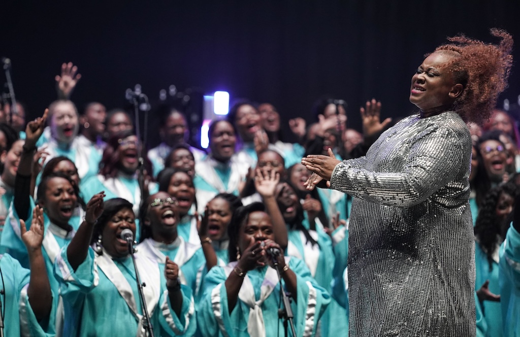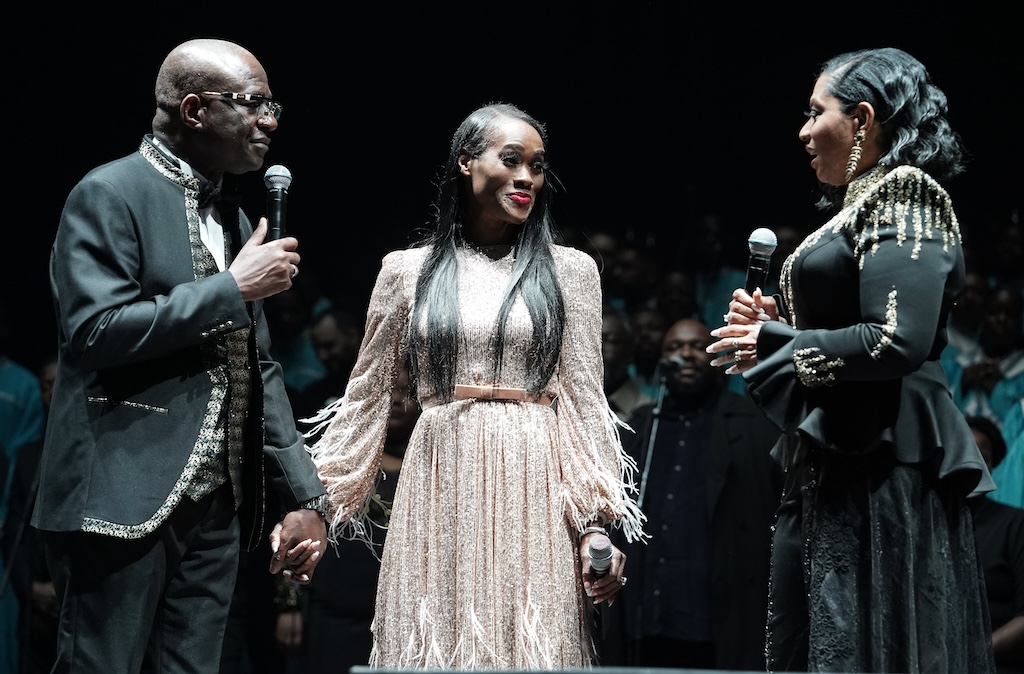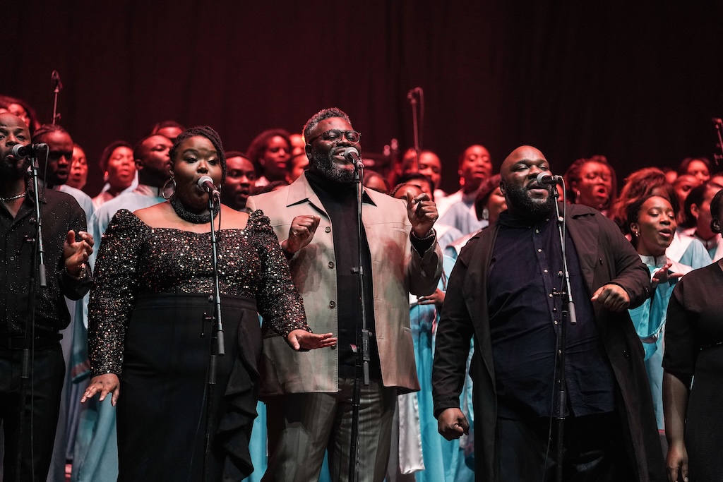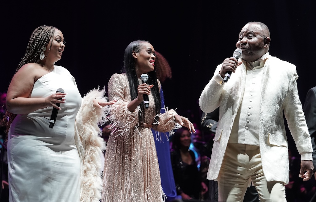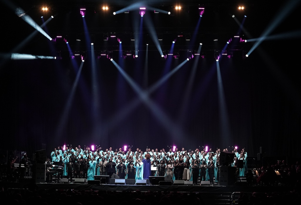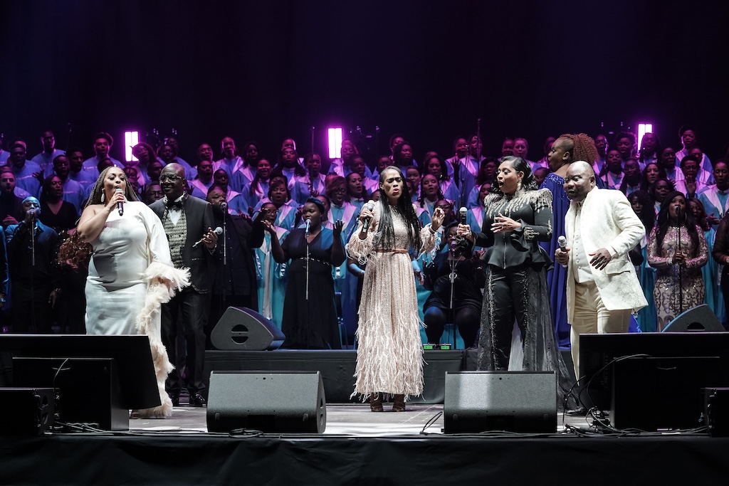 Le pari, audacieux, est une réussite, et la salle est copieusement remplie quand les lumières de la scène s’allument pour révéler un casting impressionnant : les 200 chanteurs du Total Praise Mass Choir sous la direction d’Isabelle Ngombo, un orchestre piloté comme d’habitude par Théophane Koffi renforcé pour l’occasion par le pianiste et arrangeur Kevin Bond, collaborateur régulier depuis les années 1980 d’Edwin, Walter et Tramaine Hawkins, Stephanie Mills et Kirk Franklin récompensé plusieurs fois aux Grammys, et même une section de cordes conduite par l’arrangeur et chef d’orchestre Matt Jones, entendu sur disque avec Ledisi, John Legend et PJ Morton, entre autres ! Dès les premiers morceaux, interprétés par des solistes habituels de la chorale – Wesley Seme, Olivia Songeons, Crécilia Nonirit, Nathalie Colomb – rejoints sur quelques titres par une troupe de danse, la puissance de feu de l’ensemble est évidente, d’autant qu’elle est canalisée par des arrangements de grande qualité qui ne sacrifient pas le goût de la nuance à l’efficacité.