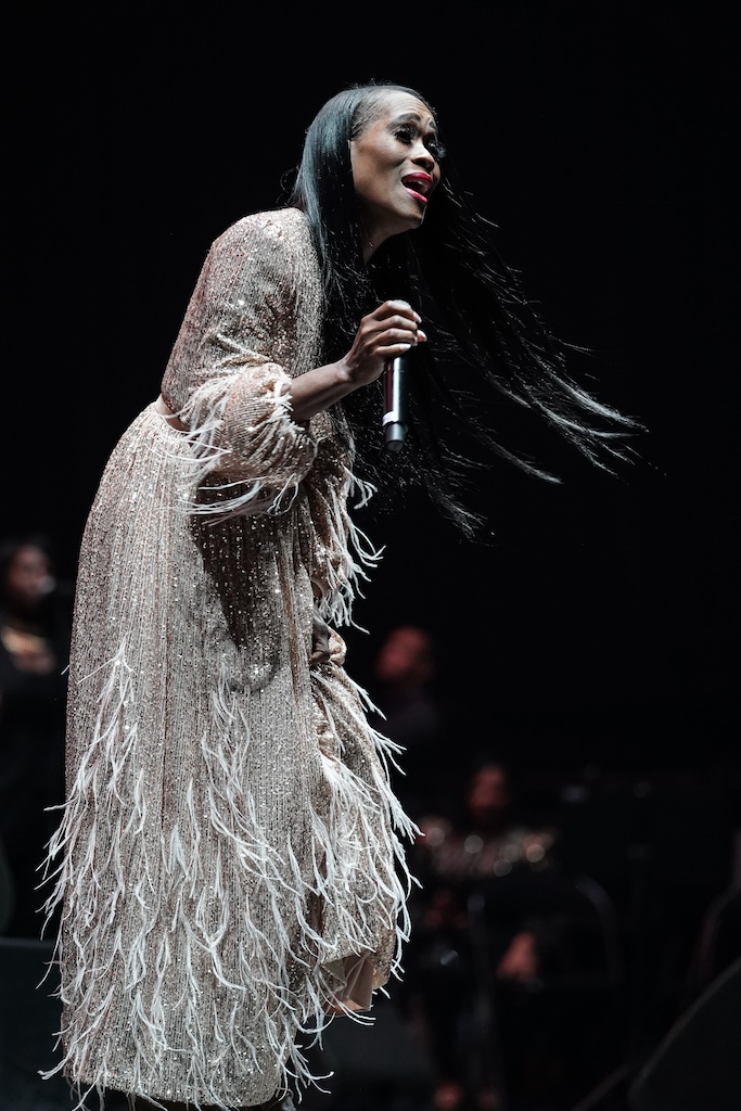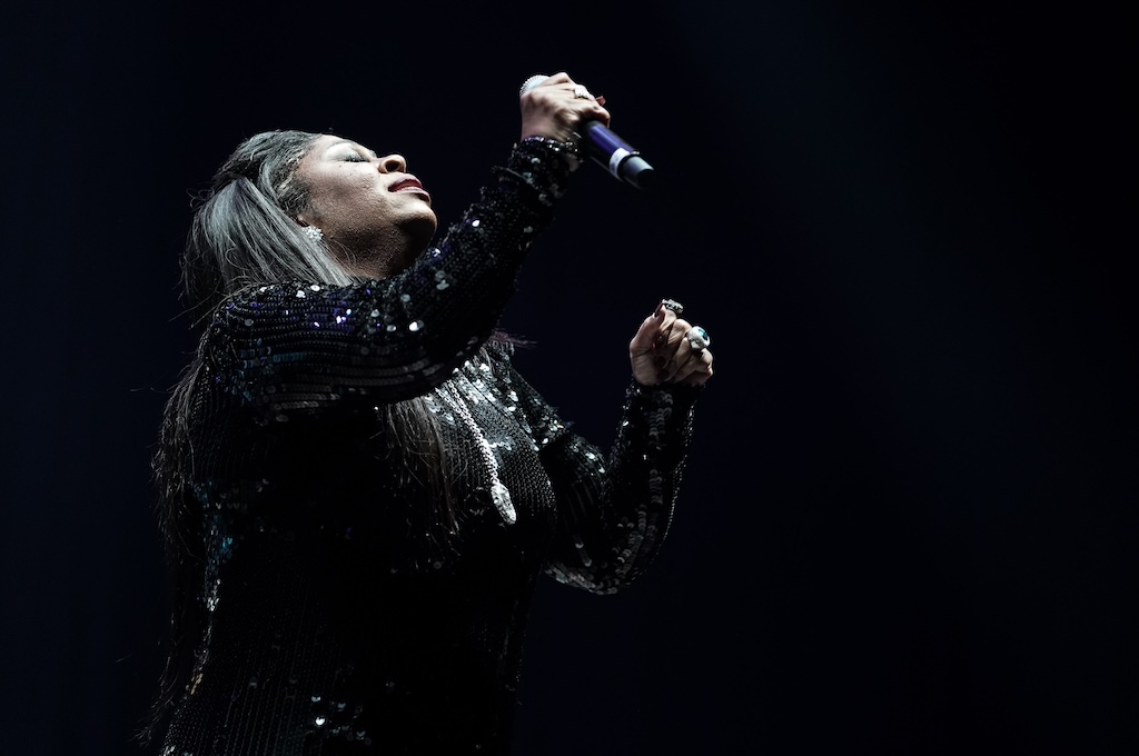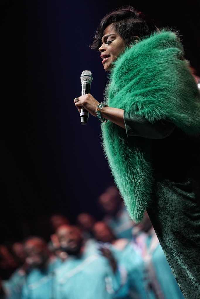Après l’entracte, c’est au tour de Kim Burrell de rejoindre la scène. Déjà présente l’année dernière et aussi à Jazz à Vienne, la chanteuse semble compter sur le public européen pour relancer une carrière qu’elle a elle-même sabotée à coup de propos homophobes et injurieux, et la salle lui réserve un accueil très enthousiaste dès son premier titre, We are not ashamed, qu’elle avait enregistré il y a quelques années avec Myron Butler, qui lui permet de rappeler que, malgré les polémiques, elle n’a rien perdu de ses qualités vocales stupéfiantes. For every mountain, qu’elle attaque seule avec le pianiste avant d’être rejointe par la chorale, illustre sa capacité à aller extraire chaque nuance d’une chanson, avant que I see a victory, qu’elle avait enregistré avec Pharell Williams pour la bande originale du film Hidden Figures, lui donne la possibilité de montrer qu’elle n’est pas cantonnée aux titres lents. Au vu des péripéties qu’a connu sa vie ces dernières années, les paroles du Changed de Walter Hawkins lui parlent probablement très personnellement, et elle en donne une lecture très intense, et c’est sous les acclamations de la salle qu’elle quitte la scène.