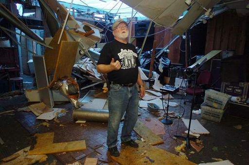Le 18 avril, nous faisions état ici des dégâts considérables infligés au siège des disques Malaco à Jackson, suite à une tempête qui s’était abattue sur le Mississippi trois jours plus tôt. On craignait pour la pérennité de Malaco, mais des nouvelles plus rassurantes nous sont parvenues. Cela permet également d’en savoir un peu plus sur les dégâts. La toiture de l’entrepôt est très endommagée, mais c’est surtout le bâtiment principal qui a souffert, ce que confirme le président Tommy Couch Sr. : « Nous attendons l’accord de la compagnie d’assurance avant d’entreprendre sa destruction totale. » Mais Couch et le vice-précédent Wolf Stephenson (sur notre photo dans ce qui reste du studio d’enregistrement) sont optimistes et espèrent pouvoir reconstruire un bâtiment plus grand et plus moderne. Il est vrai que les milliers de précieuses bandes originales, mieux protégées dans un édifice plus solide, ont été préservées même si quelques-unes ont pris l’eau. C’est tout de même un long travail qui attend les gérants du label…