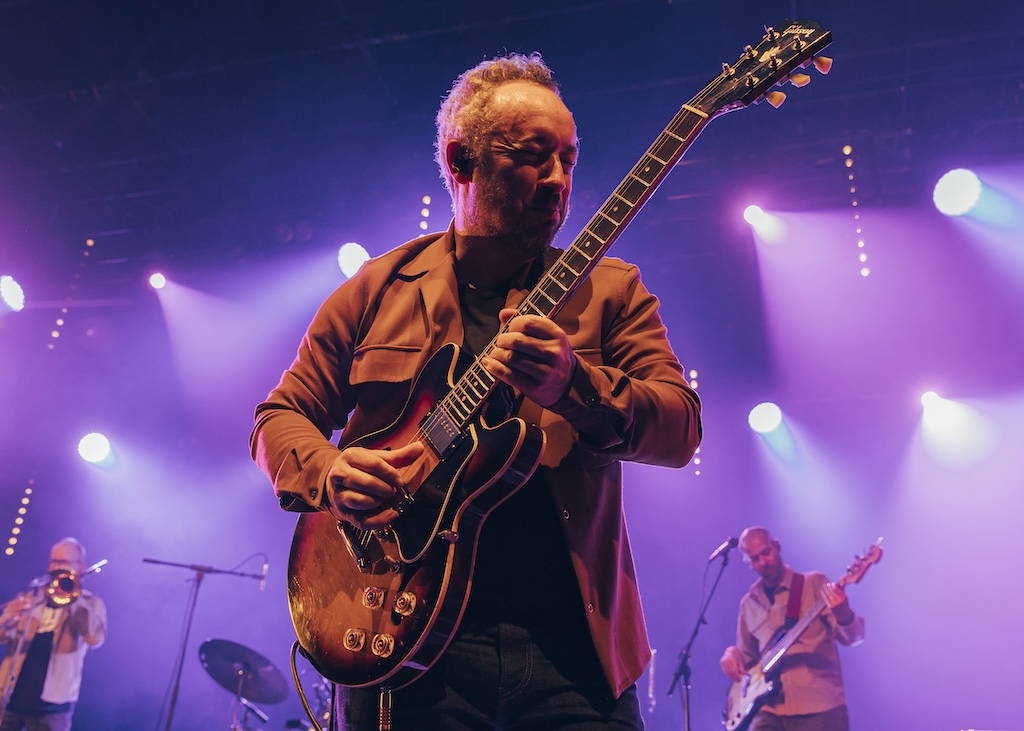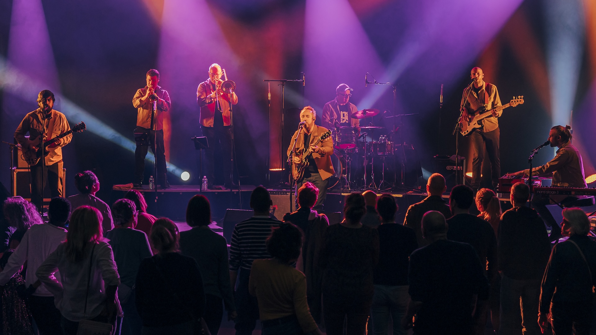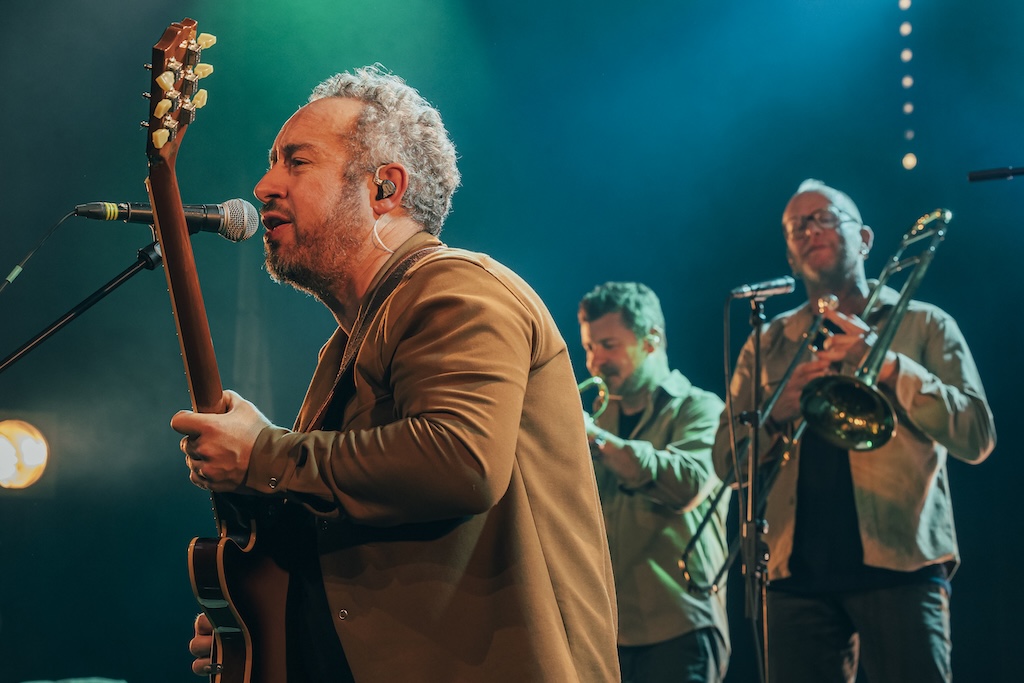 Après une intro instrumentale pour se dégourdir les doigts, le groupe entame les festivités avec l’une des chansons les plus marquantes de son dernier CD, le single A little bit of soul, dotée d’arrangements et de breaks retravaillés par rapport à la version originale. Un bonheur de groove suivi de la super funky I.M possible, chapeautée d’un bouillonnant solo de trompette signé Pierre-Marie Humeau. Arnaud Fradin troque alors sa rutilante ES 339 sunburst pour une guitare acoustique et calme le jeu avec la belle et nostalgique Better now dont les sha la la la las sont repris par un public enthousiaste et conquis. L’orchestre persévère dans le registre mellow soul avec la fondante To build something, extrait de leur opus précédent, le remarquable “Love, Tears & Guns” de 2019. La section rythmique (les fidèles Igor Pichon à la basse et Richard Housset à la batterie) est impressionnante de souplesse tandis qu’Arnaud décoche son fameux falsetto, douillettement soutenu par les chœurs d’à peu près tout l’orchestre.
